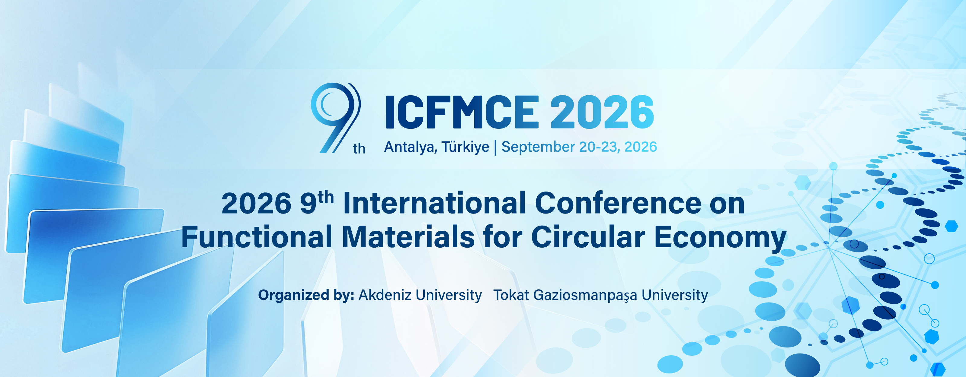 2026年第九届循环经济功能材料国际会议由阿克德尼兹大学与加齐奥斯曼帕萨大学共同主办,将于2026年9月20至23日在土耳其安塔利亚召开。更多会议信息请访问:www.icfmce.org